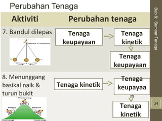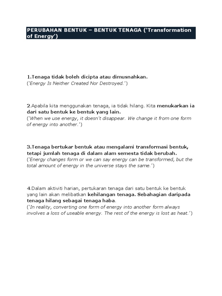 Perubahan bentuk tenaga Tenaga tidak Kita memerlukan boleh dicipta tenaga untuk atau dimusnah melakukan kerja Tenaga berubah perubahan dari satu bentuk bentuk tenaga ke. Basikal ini telah berjaya melakukan ujian terbang selama 5.