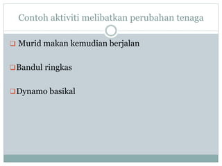 Tenaga Elektrik Tenaga. Contoh-contoh perubahan bentuk tenaga Mengayuh basikal Semasa mengayuh basikal tenaga kimia daripada makanan yang dimakan telah berubah kepada tenaga kinetik. Perubahan tenaga berlaku dalam stesen jana kuasa terma.